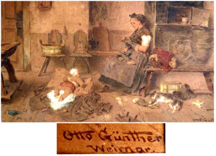 Zum Künstler: Otto Edmund Günther, geb: 1838 Halle - gest: 1884 Weimar, deutscher Maler und Illustrator. Studium: 1858 - 1861 Akademie Düsseldorf, 1863 - 1866 Studium an der Akademie in Weimar bei von Ramberg, F. Preller d.Ä., und F. Pauwels, Nach d. Studium blieb er in Weimar. 1864, 1866, 1870/71 Kriegsmaler. 1876 - 1880 war er Lehrer an der Akademie in Königsberg. Dann wieder zurück in Weimar. Zu seinen Schülern gehörte Lovis Corinth. Anfangs große Kompositionen, später auch kleinere Gemälde. Seine Bilder zeigen das Leben Thüringer Landsleute. Literatur: Th-Becker, Wikipedia, Scheidig, Artprice